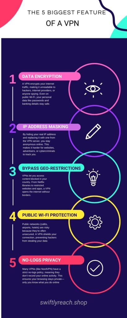 A VPN encrypts (locks) your internet data, like passwords, banking details, and messages. This means hackers, advertisers, or even your internet provider can’t see or steal your personal information.